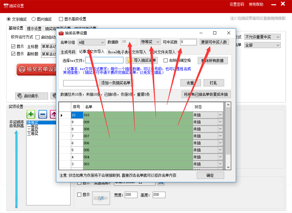 支持自动生成编号,可自动删除不想出现的数字,支持从TXT或Exlce中导入抽奖人员,支持抽奖名单补空格使长度相同;