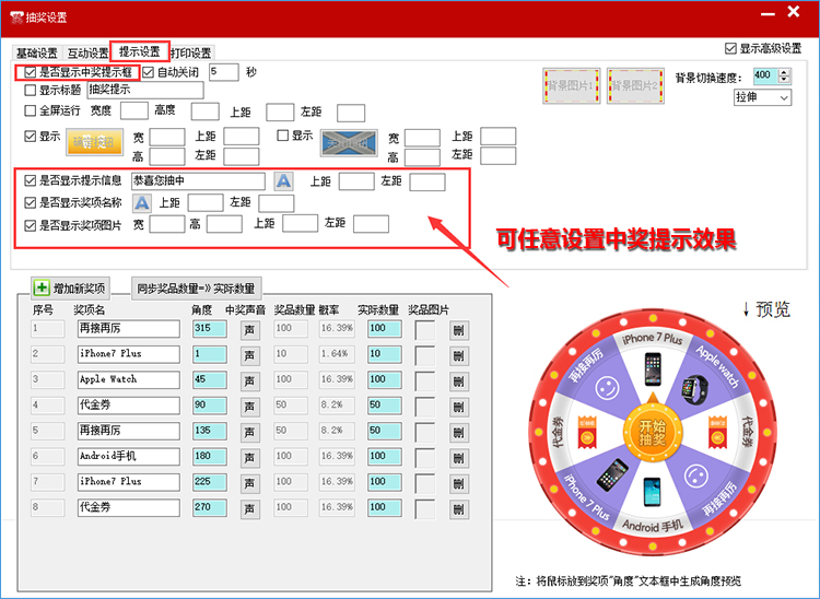支持中奖中奖提示,可设置自动关闭提示信息;