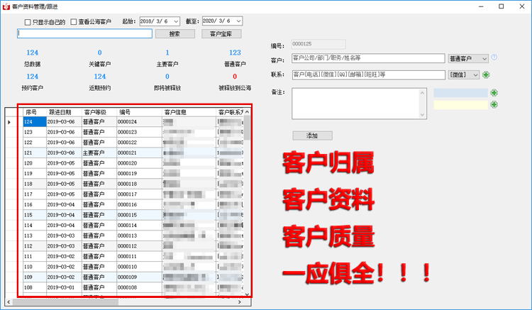 支持生成客户编号顺序,联系方式和备注各项信息的便捷添加方式,累积客源。