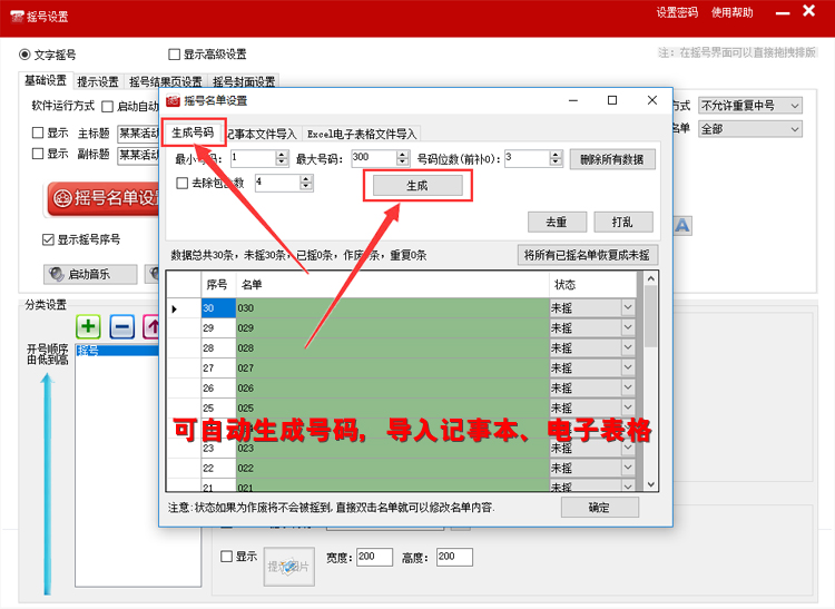 支持由数字、字母、中文汉字混合、支持手机号码、身份证号码等各种名单。支持名单导入。支持自动生成号码,可以自动删除不想出现的数字。支持隐私保护,可屏蔽部分字符(如手机号码13306667777,屏蔽部分字符后133****7777);