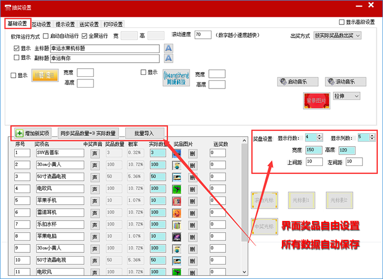 支持自定义界面,界面所有部件(标题、中奖人等)的字体大小、文字、颜色、位置、背景等都可手动或自动调整;