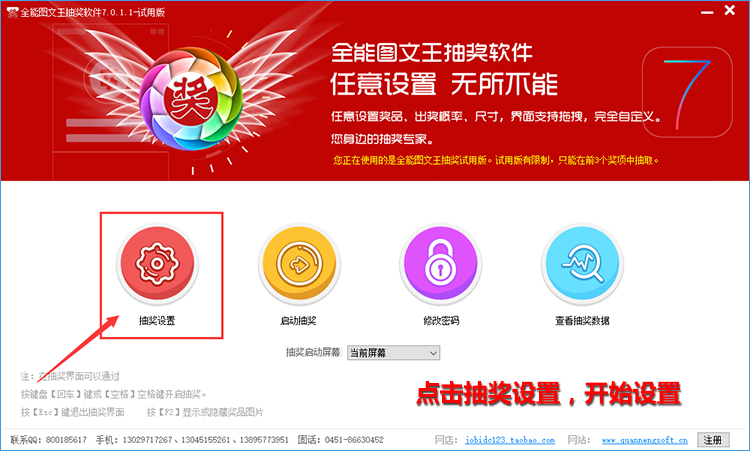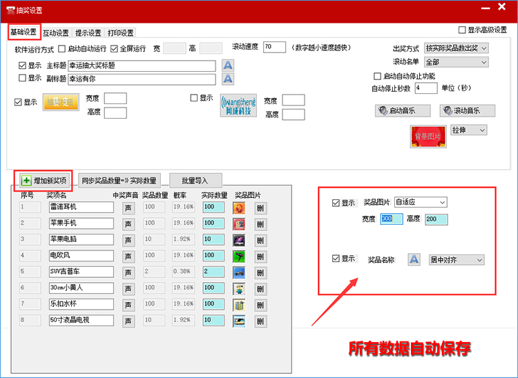 支持自定义界面,界面所有部件(标题、中奖人等)的字体大小、文字、颜色、位置、背景等都可手动或自动调整;