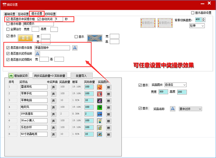 支持中奖中奖提示,可设置自动关闭提示信息;