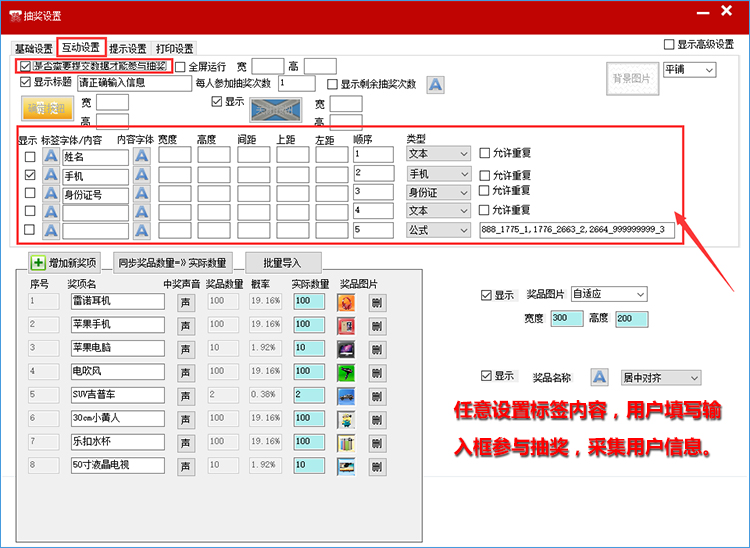 支持用户界面完全自定义,任意添加奖品图片、数量、尺寸、音乐,任意修改文字的内容、字体、大小、颜色、位置;