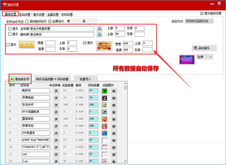 支持自定义界面,界面所有部件(标题、中奖人等)的字体大小、文字、颜色、位置、背景等都可手动或自动调整;